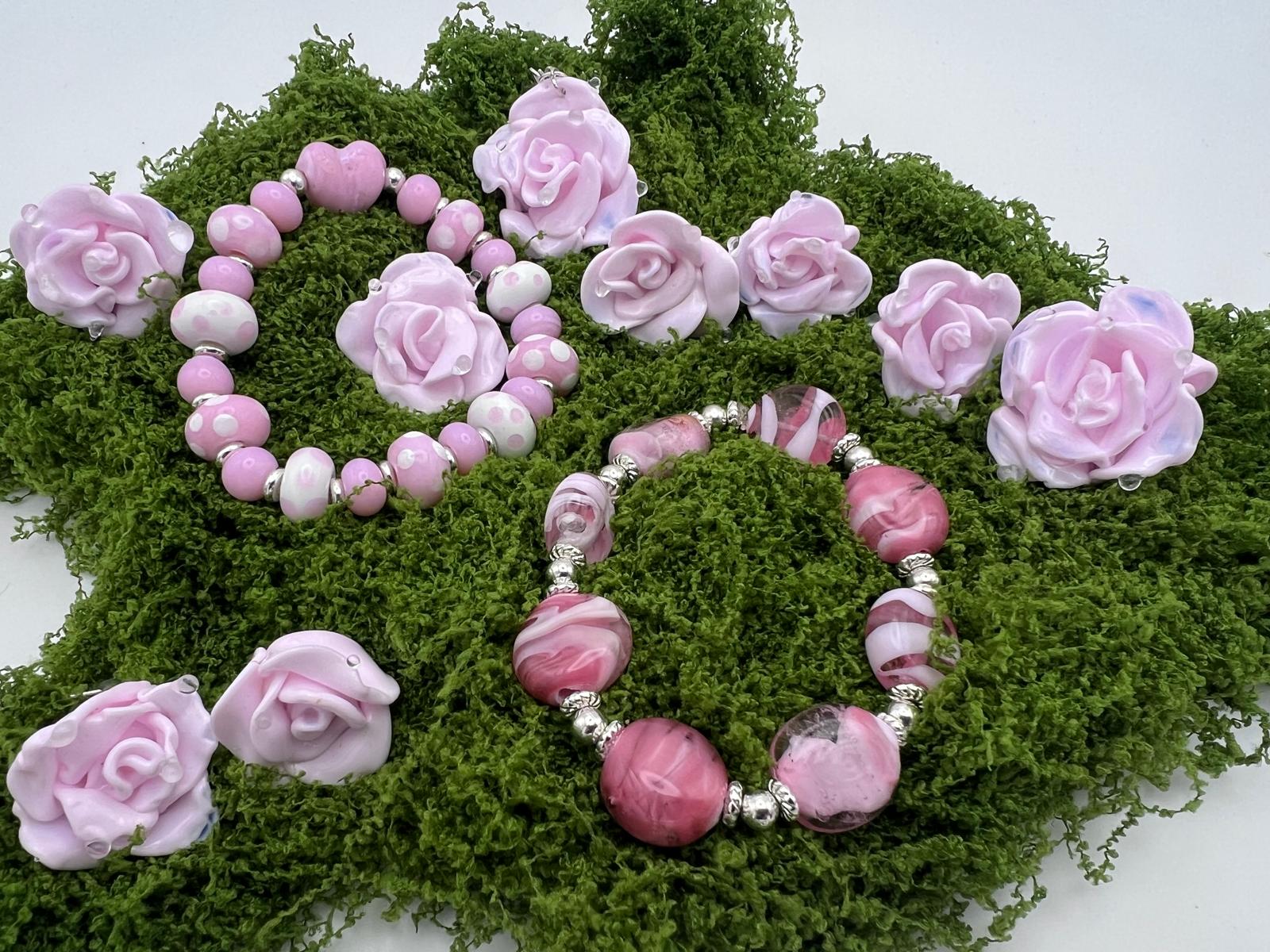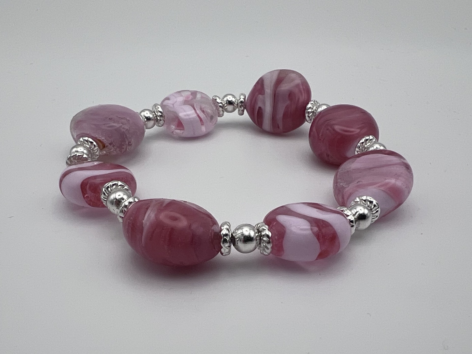Un bracelet perle fabriqué à la main et sous la flamme de mon chalumeau dans mon atelier de Neuville-aux-Bois près d’Orléans, Loiret. Un bracelet romantique avec ses couleurs rose clair et rose doré, pour vous faire plaisir ou pour offrir. Bracelet léger, beaucoup de personnes pensent que les bijoux en verre vont être lourds, mais non ils sont très agréables à porter.
