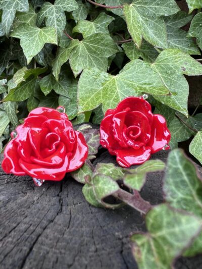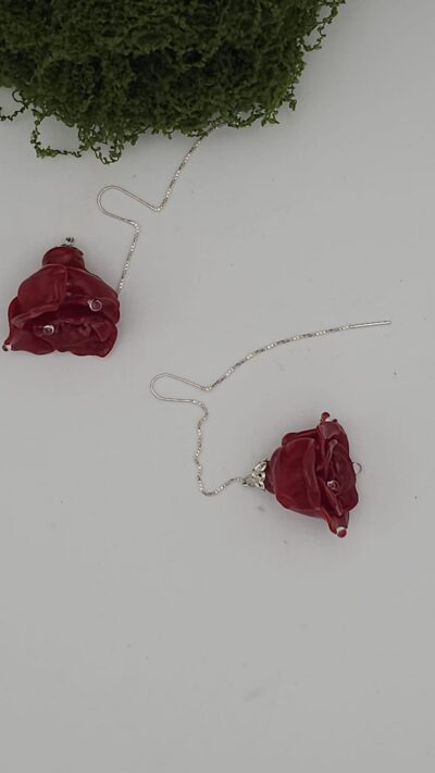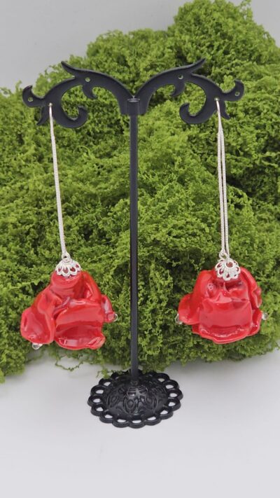 Une jolie paire de boucles d’oreilles composée d’une rose rouge avec ses gouttes de rosée du matin. Les boucles sont montées sur une chaine vénitienne de 45 mm en argent sterling 925. C’est dans mon atelier de Neuville-aux-Bois que j’ai fabriqué ces boucles d’oreilles femme en verre de Murano. Des boucles d’oreilles fraiches et colorées qui vous donneront un look printanier et complèteront égaiement votre tenue.