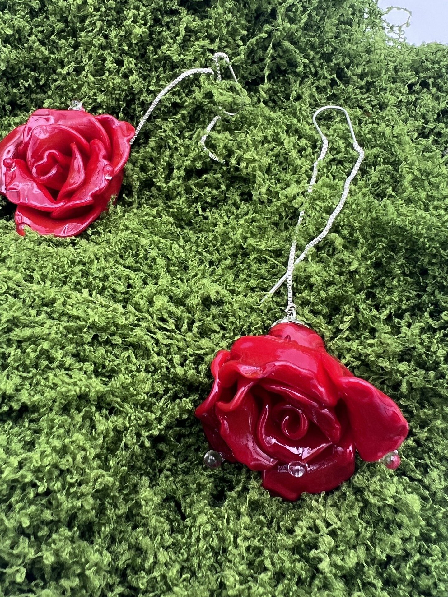 Boucles d’oreilles femme Rose rouge et ses gouttes de rosée du matin