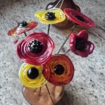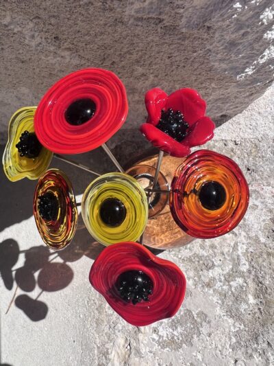 Un bouquet composé d’un petit vase de 10cm de hauteur et de sept petits coquelicots sertis sur des tiges en inox de 11 à 14cm de hauteur. C’est dans mon atelier de Neuville-aux-Bois près d’Orléans que je fabrique mes fleurs. Vif, moderne et élégant, ce bouquet de fleurs en verre de Murano apportera de la couleur et une note raffinée à votre intérieur ou votre jardin. Une jolie décoration en verre, un cadeau déco original. Des fleurs éternelles sans entretien qui ne faneront jamais, elles auront juste besoin d’un petit coup de plumeau de temps en temps.