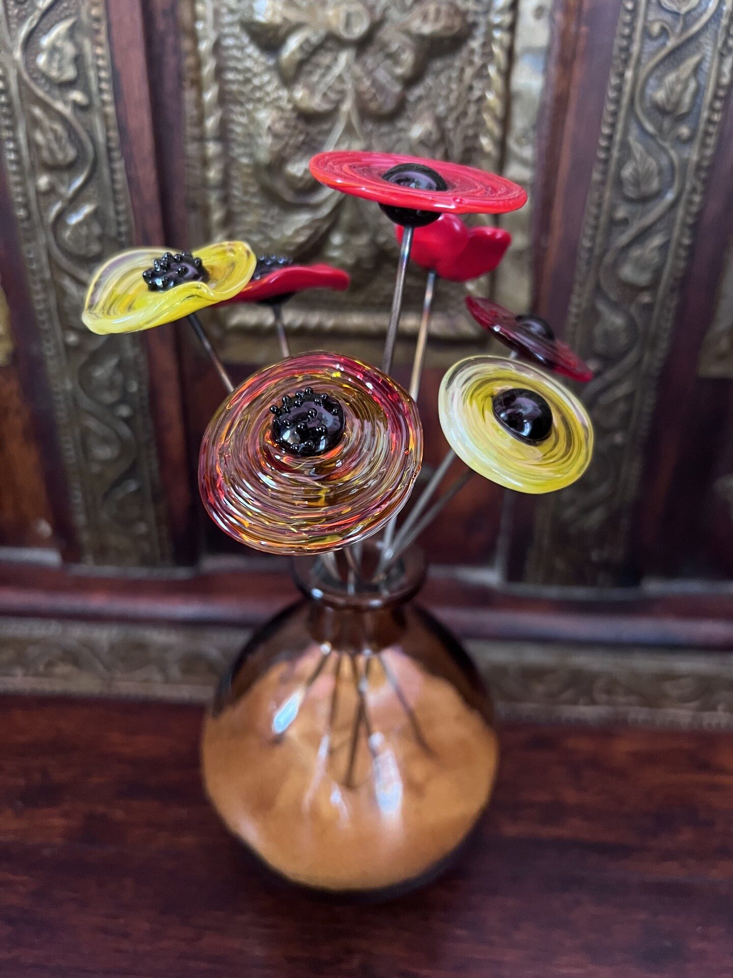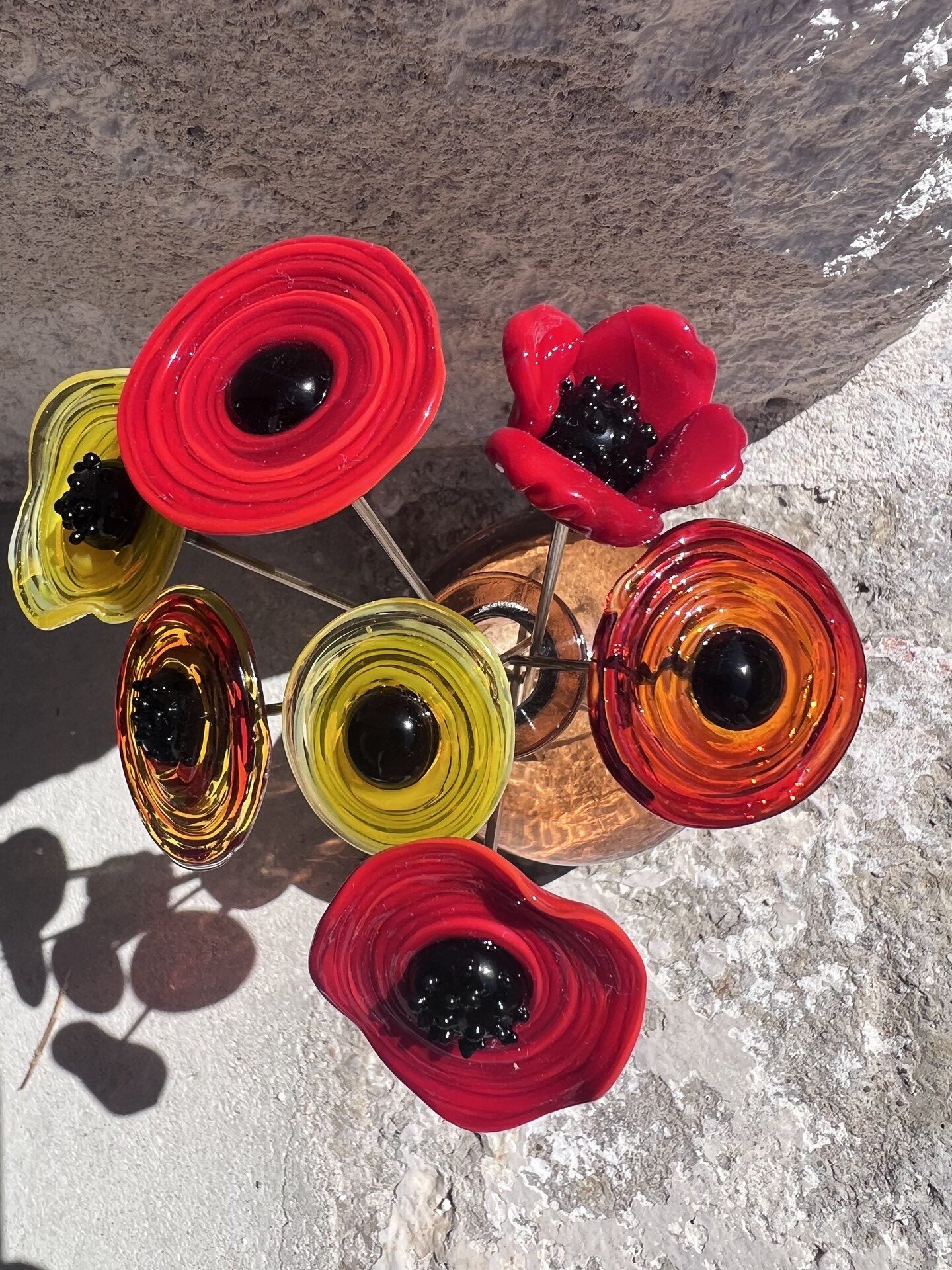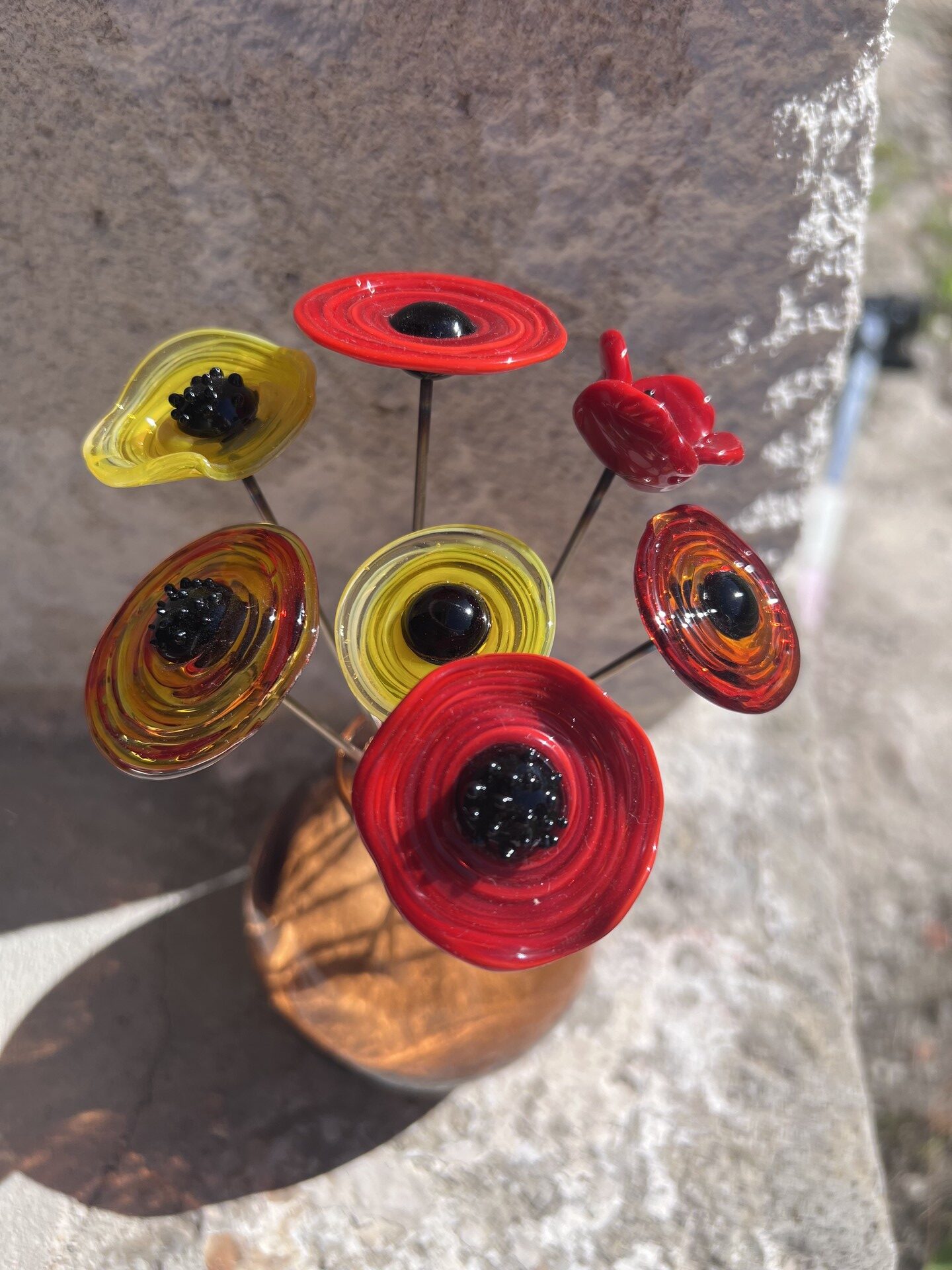 Un bouquet composé d’un petit vase de 10cm de hauteur et de sept petits coquelicots sertis sur des tiges en inox de 11 à 14cm de hauteur. C’est dans mon atelier de Neuville-aux-Bois près d’Orléans que je fabrique mes fleurs. Vif, moderne et élégant, ce bouquet de fleurs en verre de Murano apportera de la couleur et une note raffinée à votre intérieur ou votre jardin. Une jolie décoration en verre, un cadeau déco original. Des fleurs éternelles sans entretien qui ne faneront jamais, elles auront juste besoin d’un petit coup de plumeau de temps en temps.