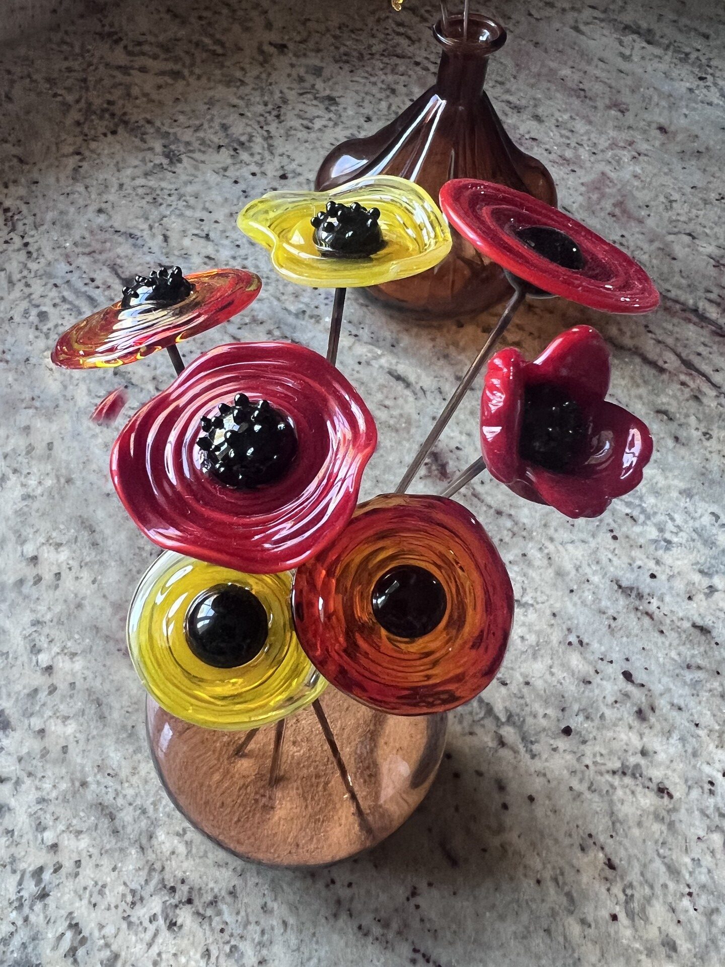 Bouquet de fleurs en verre de Murano, composé d’un vase et de sept petits coquelicots