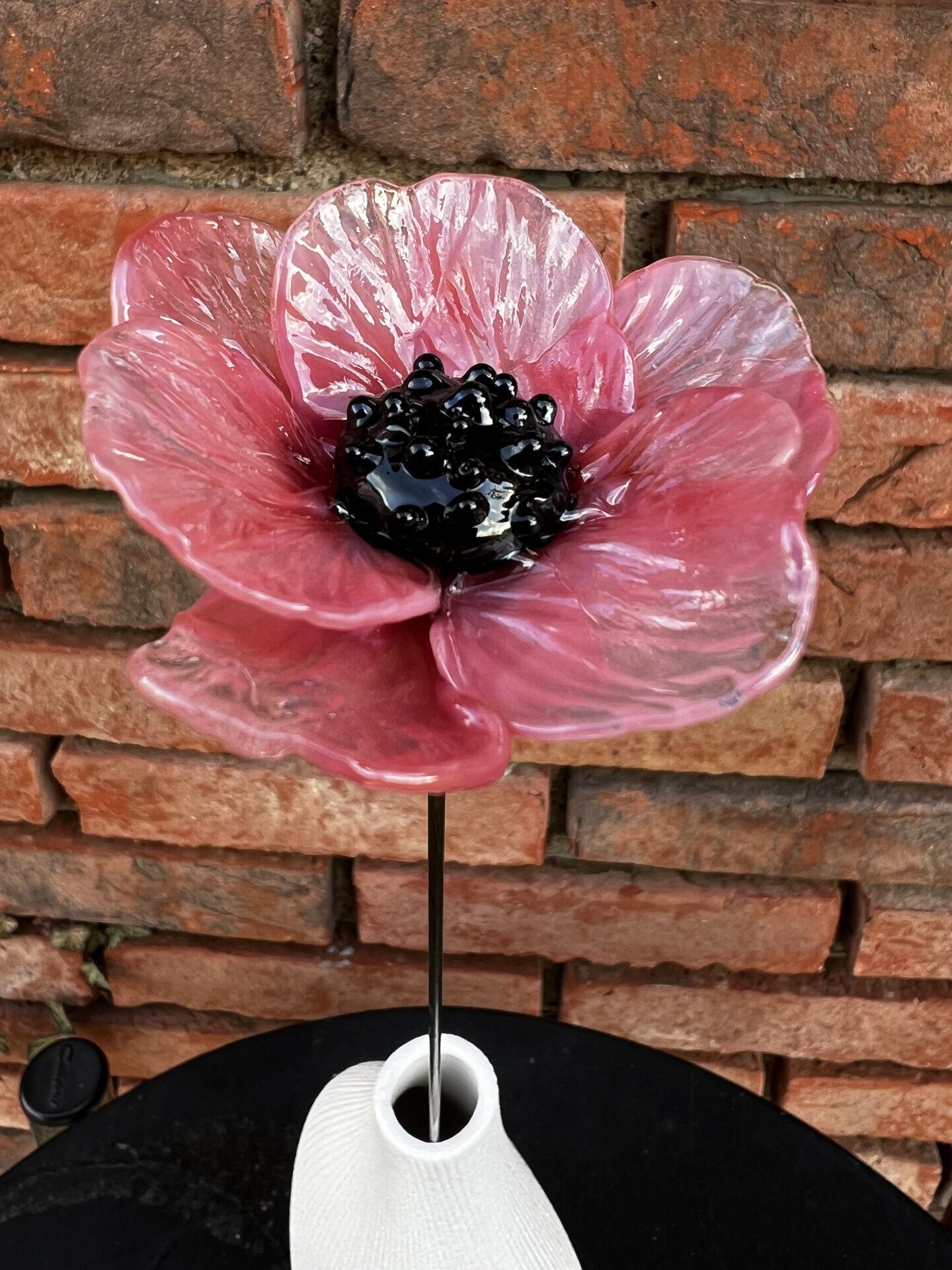 Coquelicot en verre, rose mystique, à pétales, cœur noir avec picots