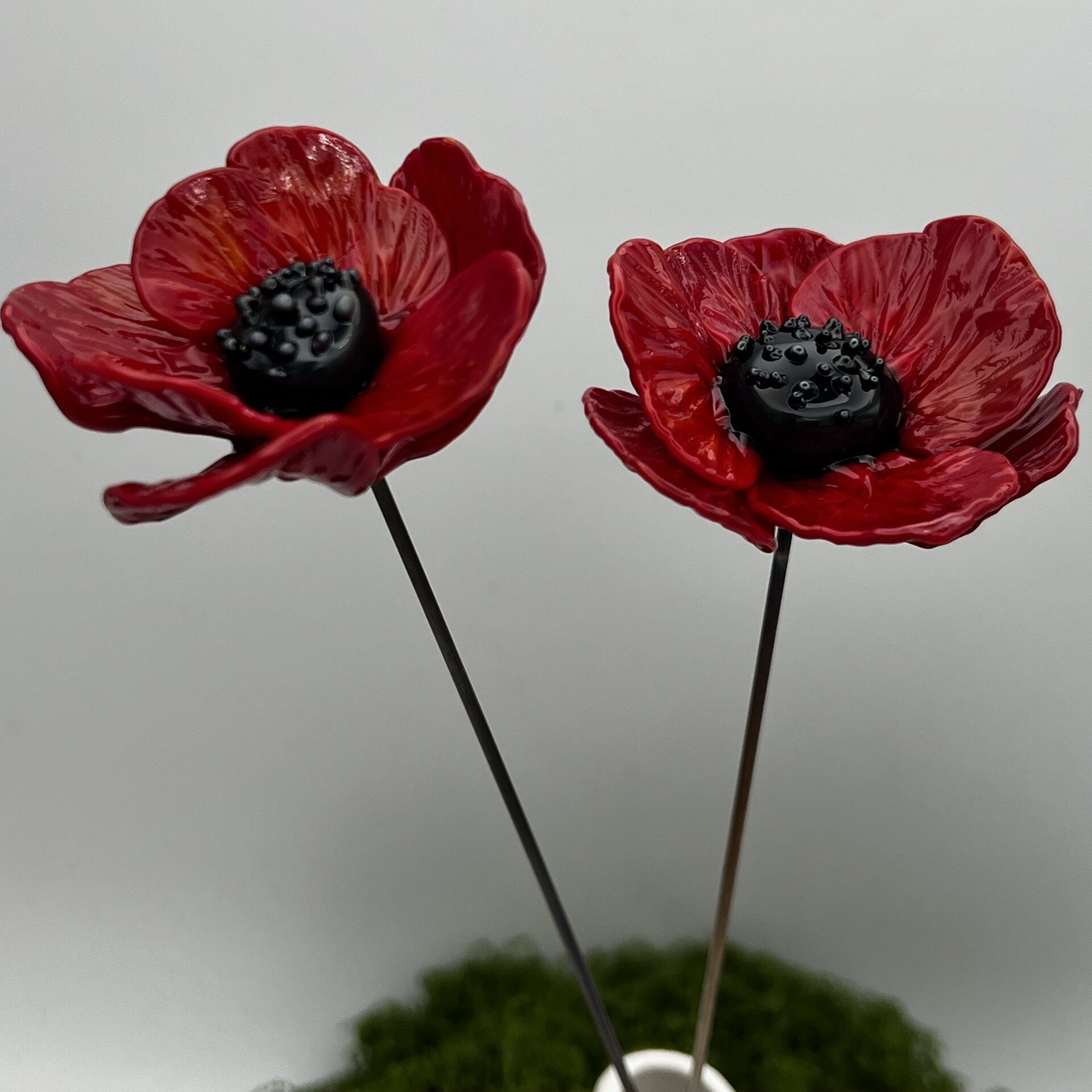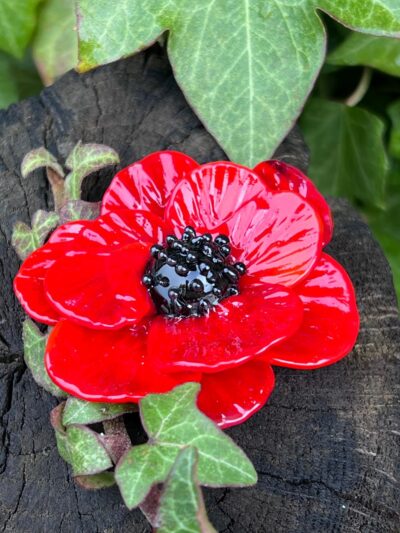 Coquelicot en verre, rouge vif, à pétales, cœur noir avec picots