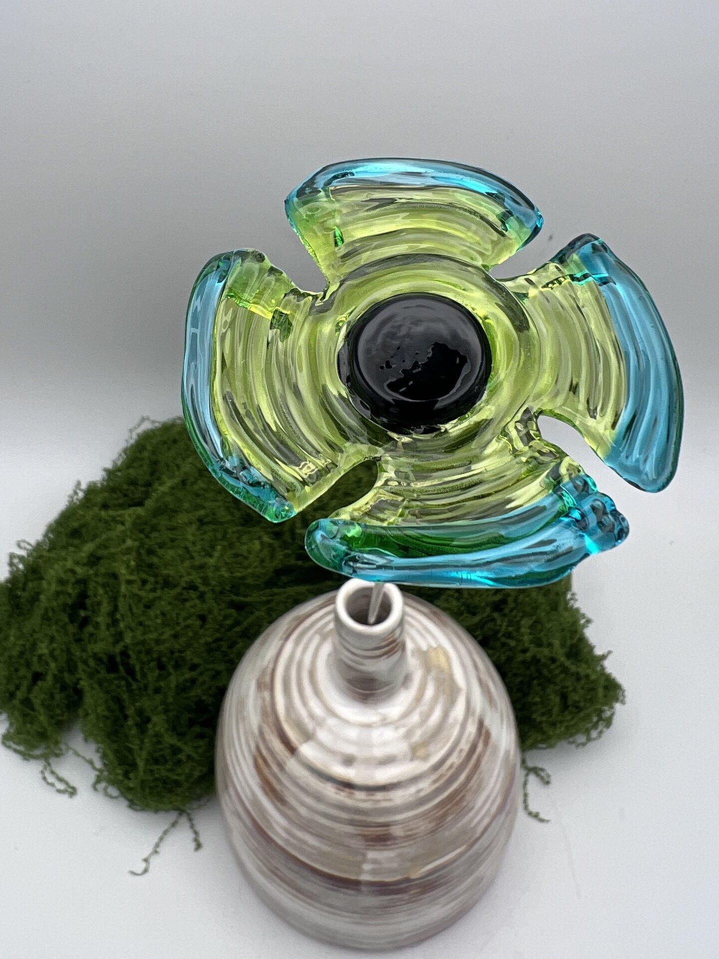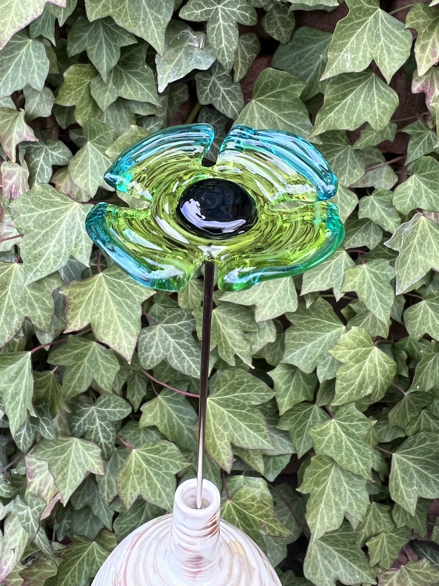 Fleur en verre décoration : coquelicot vert tilleul et vert émeraude, cœur noir