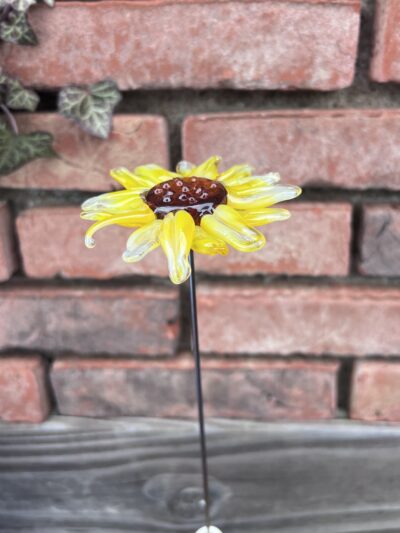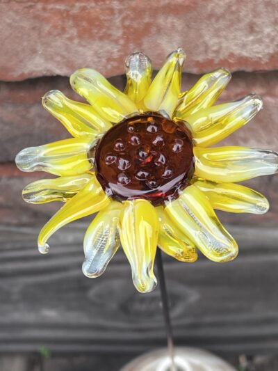 Un tournesol fabriqué à la main dans mon atelier de Neuville-aux-Bois près d’Orléans, Loiret. Moderne, vif et élégant, ce tournesol en verre de Murano apporta de la couleur et une note raffinée à votre intérieur. En pièce unique ou en bouquet : une jolie décoration en verre, un cadeau déco original. Une fleur éternelle qui n’a pas besoin d’entretien et qui ne fanera jamais. Elle aura juste besoin d’un petit coup de plumeau de temps en temps.