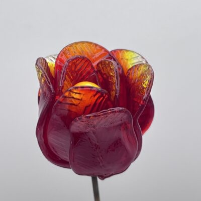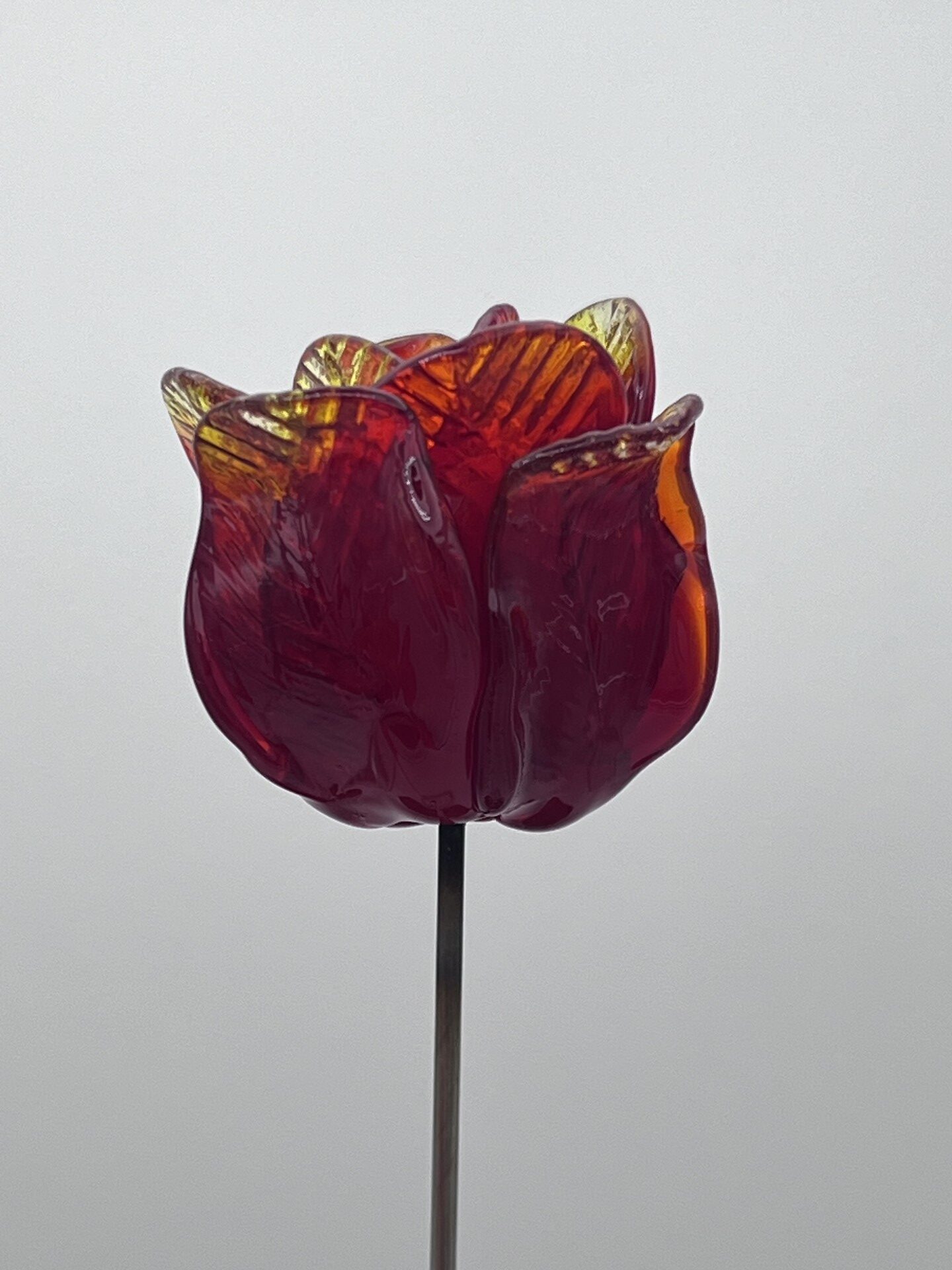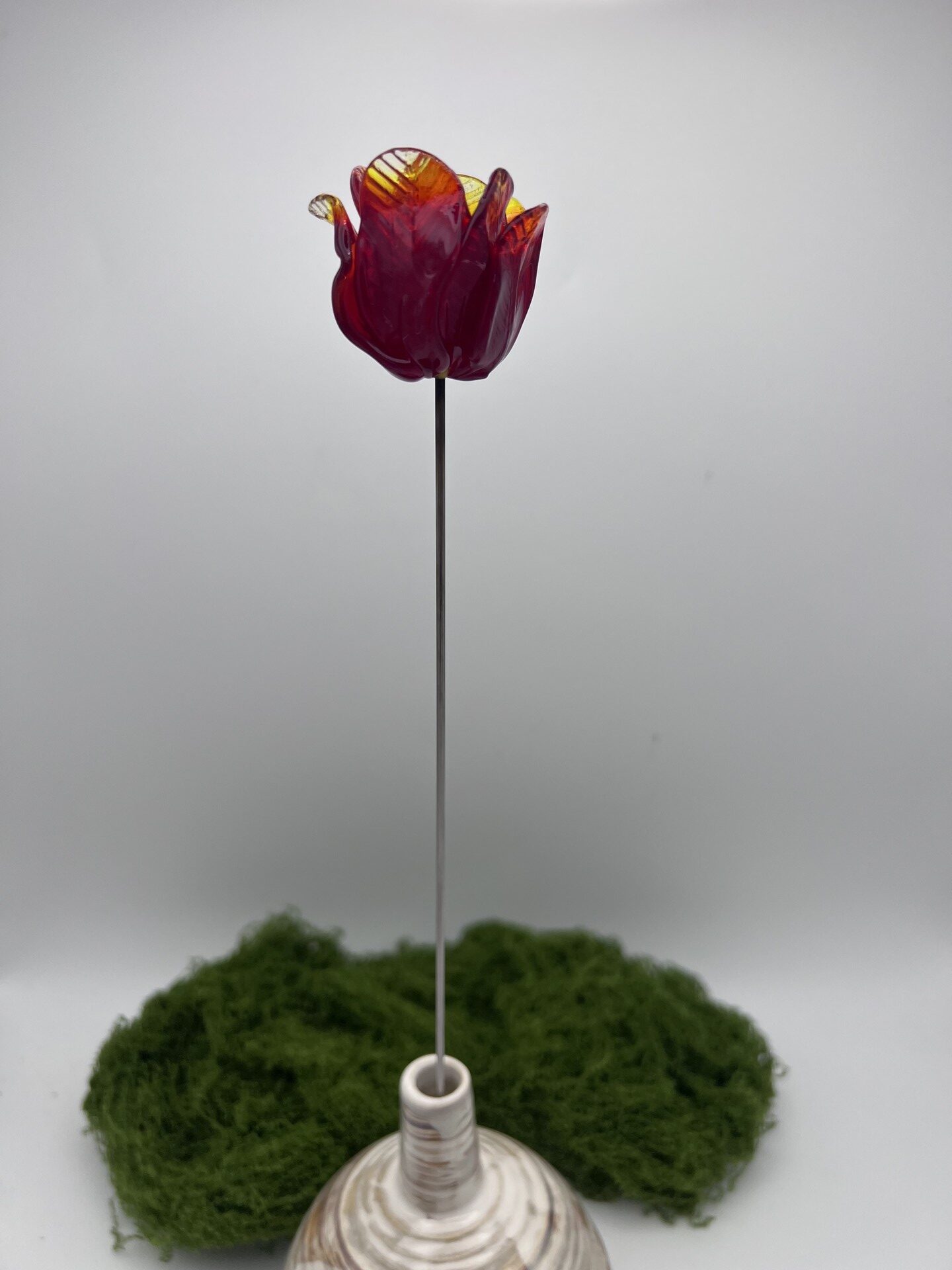 Une fleur fabriquée à la main dans mon atelier de Neuville-aux-Bois près d’Orléans, Loiret. Cette fleur en verre de Murano tulipe n’a pas besoin d’entretien, elle ne fanera jamais, elle aura juste besoin d’un petit coup de plumeau de temps en temps. Vives, modernes et élégantes, les fleurs en verre de Murano apportent de la couleur et une note raffinée à nos intérieurs. En pièce unique ou en bouquet : une jolie décoration en verre, un cadeau déco original.