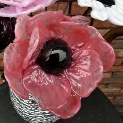 (*) Vous vous demandez peut-être « pourquoi cette pivoine PIV005 est en verre borosilicate et non pas en verre de Murano ? C’est parce que les baguettes de verre couleur rose laiteux n’existent pas en Murano.