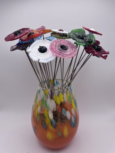 Une fleur en verre fabriquée à la main dans mon atelier de Neuville-aux-Bois près d’Orléans. Coquelicots en verre de Murano : des fleurs éternelles qui n’ont pas besoin d’entretien et qui ne faneront jamais. Elles auront juste besoin d’un petit coup de plumeau de temps en temps. Solides, vifs, modernes et élégants, les coquelicots en verre avec leurs tiges en inox de 30cm, apporteront de la couleur et une note raffinée à votre intérieur ou à votre jardin. En pièce unique ou en bouquet : une jolie décoration en verre, un cadeau original.