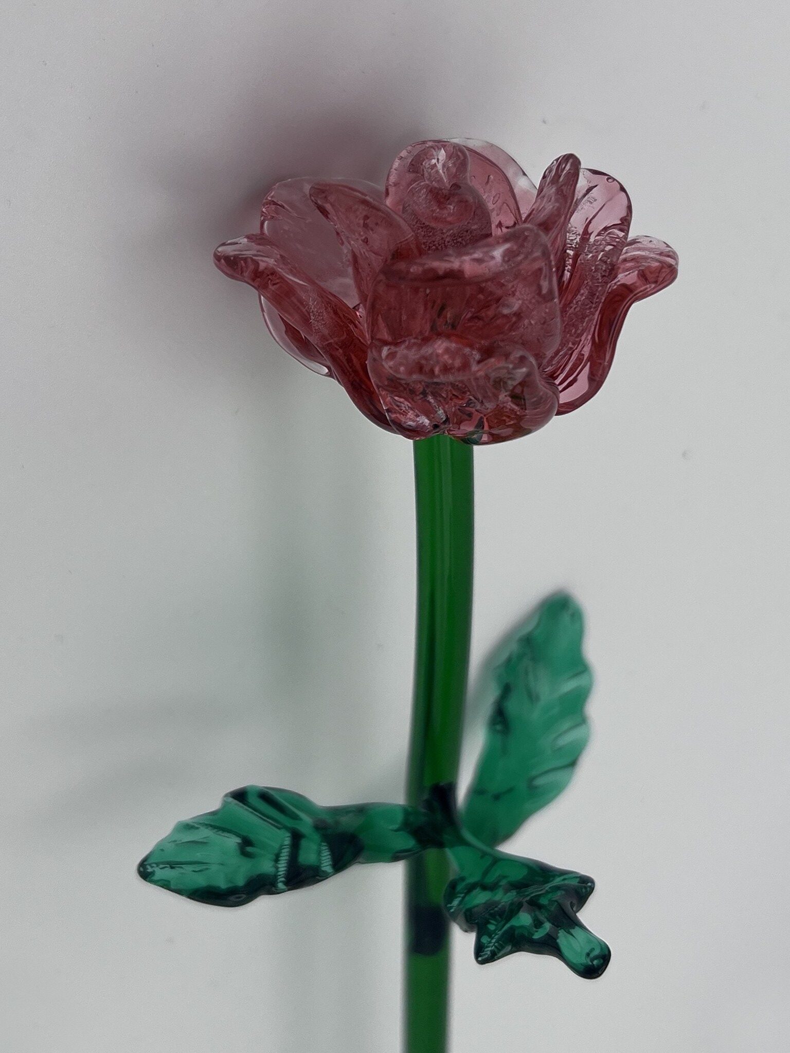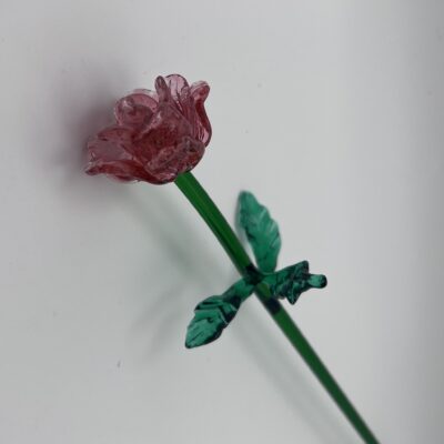 Fleur en verre pivoine, couleur rubis à l’Or, sur tige en verre avec feuilles