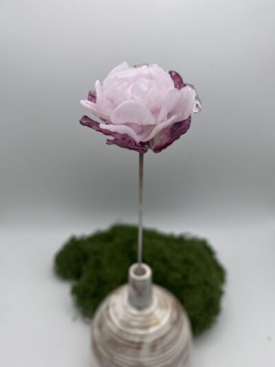 Une fleur en verre fabriquée à la main sous la flamme de mon chalumeau dans mon atelier de Neuville-aux-Bois. Cette pivoine en verre filé est éternelle et n’a pas besoin d’entretien, elle ne fanera jamais. Elle aura juste besoin d’un petit coup de plumeau de temps en temps. Vive, moderne et élégante, elle apportera de la couleur et une note raffinée à votre intérieur. En pièce unique ou en bouquet : une jolie décoration en verre, un cadeau déco original.