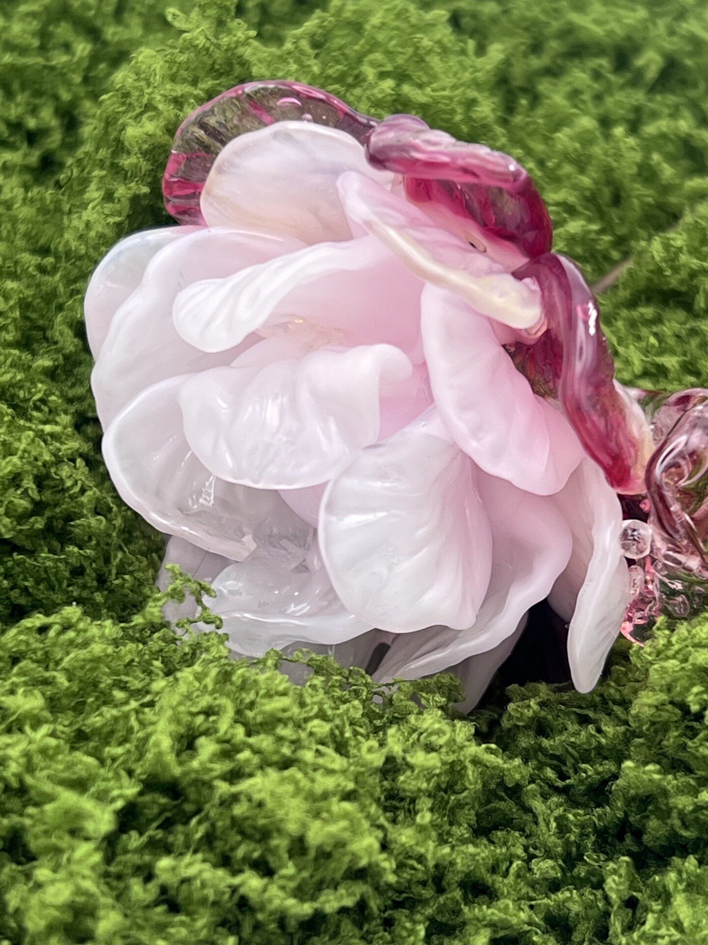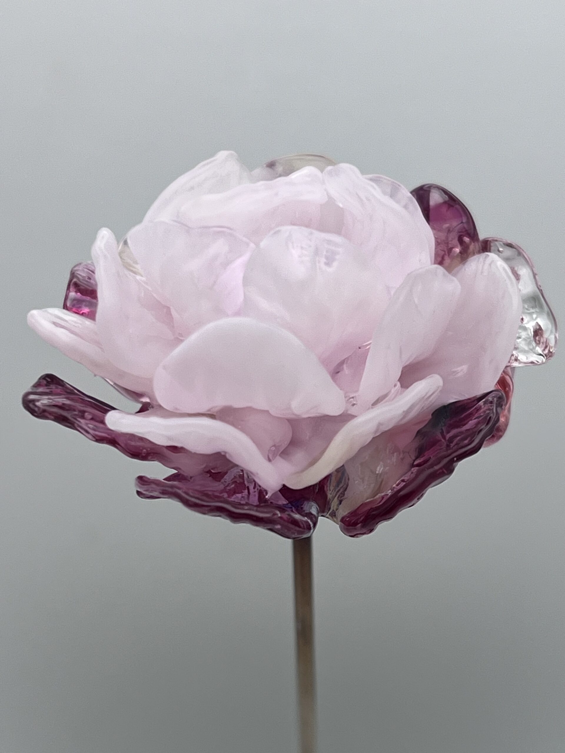 Pivoine en verre filé, bicolore, couleurs rubis à l’Or et rose opaque