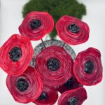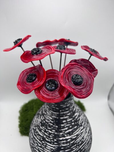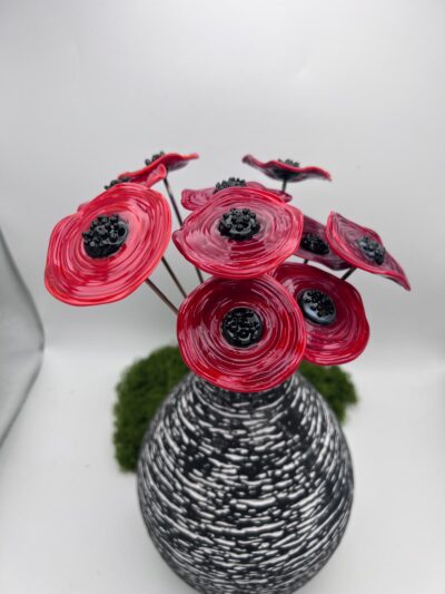 Un bouquet composé de plusieurs coquelicots rouges fabriqués à la main dans mon atelier de Neuville-aux-Bois, Loiret. Vifs, modernes et élégants, ce bouquet de coquelicots en verre de Murano apportera de la couleur et une note raffinée à votre intérieur, vos terrasses ou votre jardin. Une jolie décoration en verre, un cadeau déco original. Des coquelicots éternels qui n’ont pas besoin d’entretien et qui ne faneront jamais. Ils auront juste besoin d’un petit coup de plumeau de temps en temps.