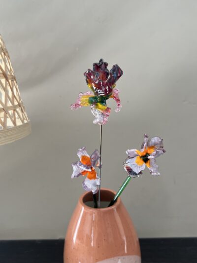 Un cadeau fleur original fabriqué à la main dans mon atelier de Neuville-aux-Bois dans le Loiret. Réalisé avec du verre de Murano, c’est une fleur éternelle qui n’a pas besoin d’entretien et qui ne fanera jamais ! En pièce unique ou en bouquet : une jolie décoration en verre, un cadeau fleur original. Cet Iris en verre filé apportera de la couleur et une note raffinée à votre intérieur.