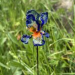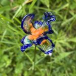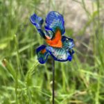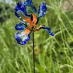 Fleurs en verre artisanales : iris bleu, orange et transparent sur tige en inox