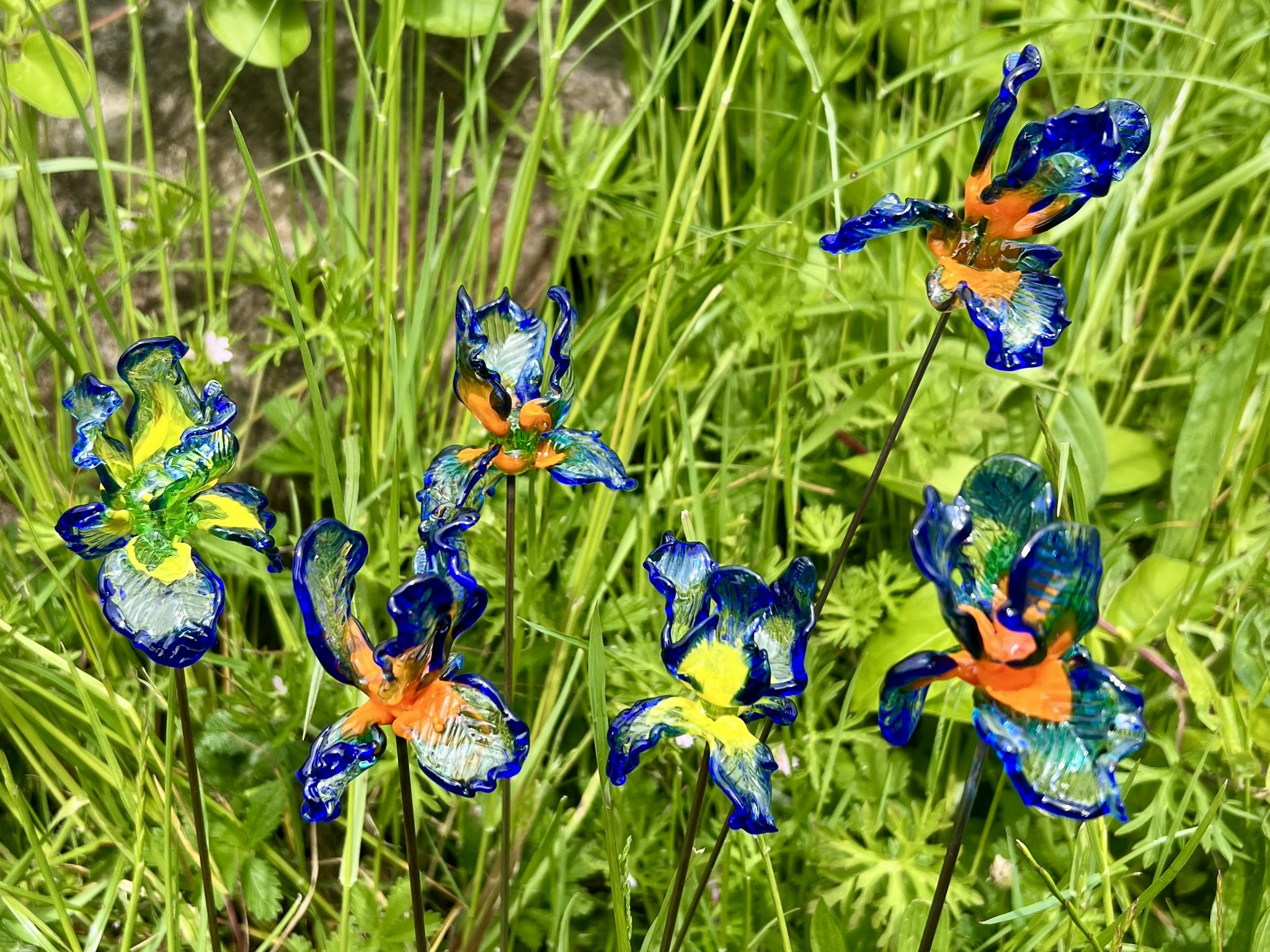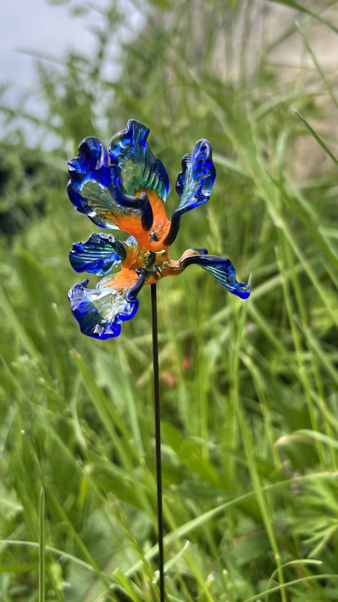 Fleurs en verre artisanales : iris bleu, orange et transparent sur tige en inox