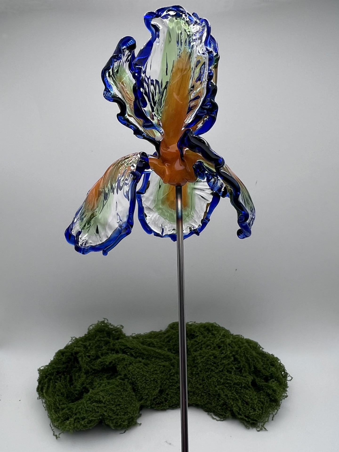 Fleurs en verre artisanales : iris orange, vert, transparent et bleu