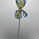 Fleurs en verre sur tige : iris jaune, vert, transparent et bleu