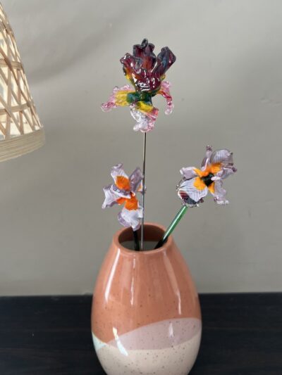 Avec ses couleurs irisées et ses formes complexes, l’iris est l’une des plus belles fleurs du monde. Vive, moderne et élégante, cette fleur en verre de Murano, fabriquée à la main dans mon atelier de Neuville-aux-Bois dans le Loiret, apportera de la couleur et une note raffinée à votre intérieur. En pièce unique ou en bouquet : une jolie décoration en verre, un cadeau original.