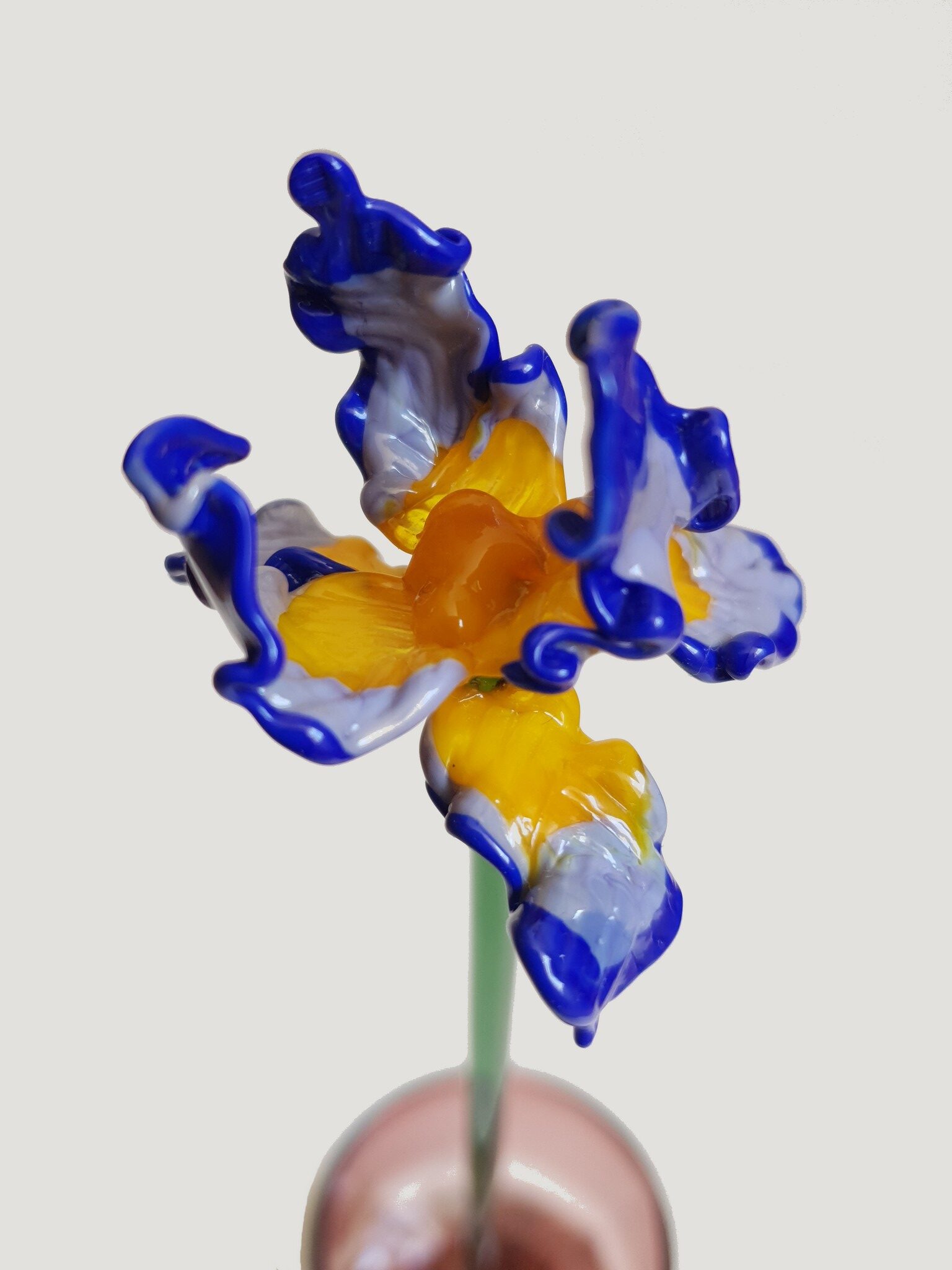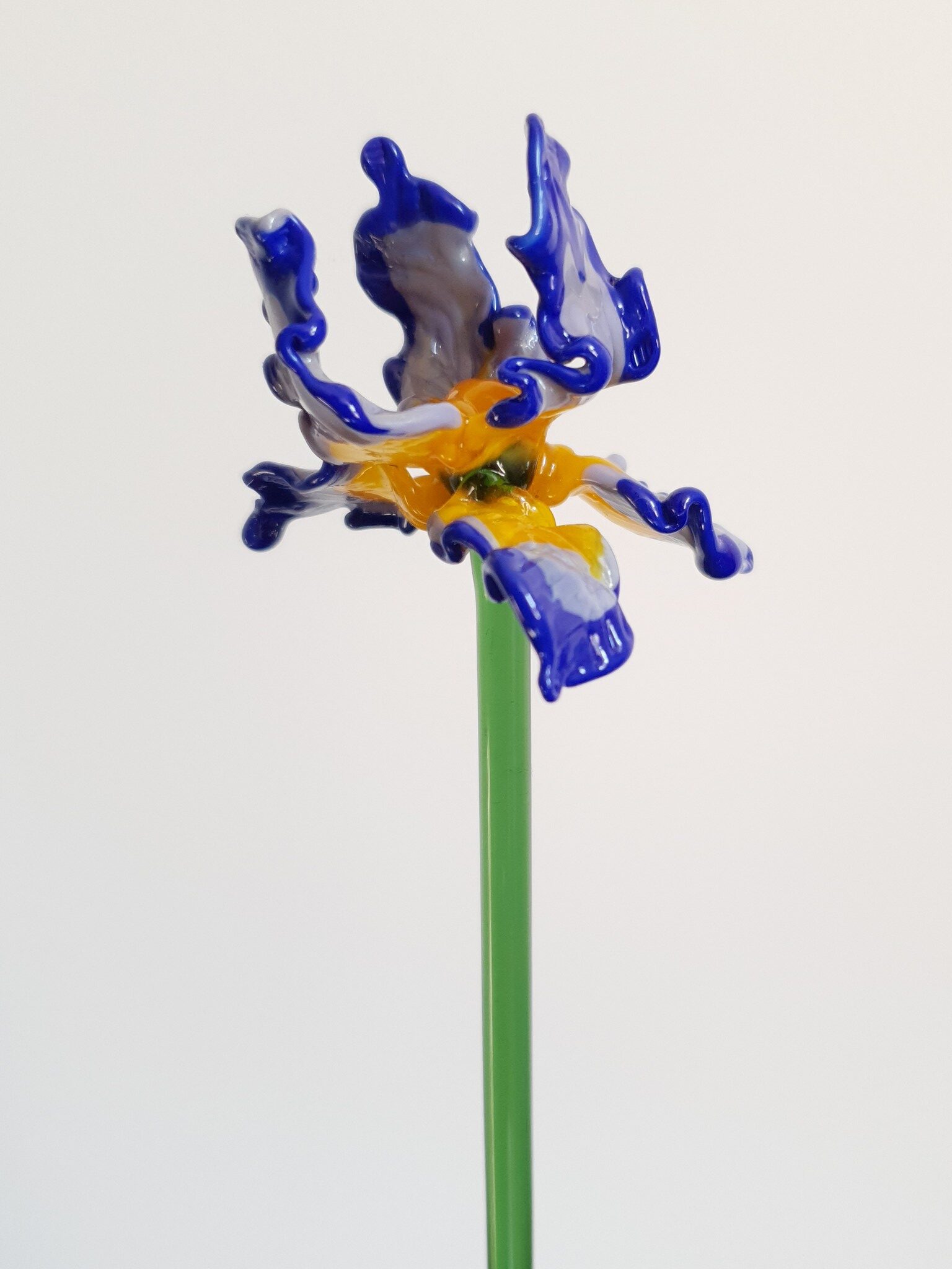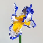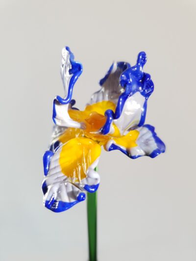 Iris en verre filé, bleu, jaune et blanc, sur tige en verre
