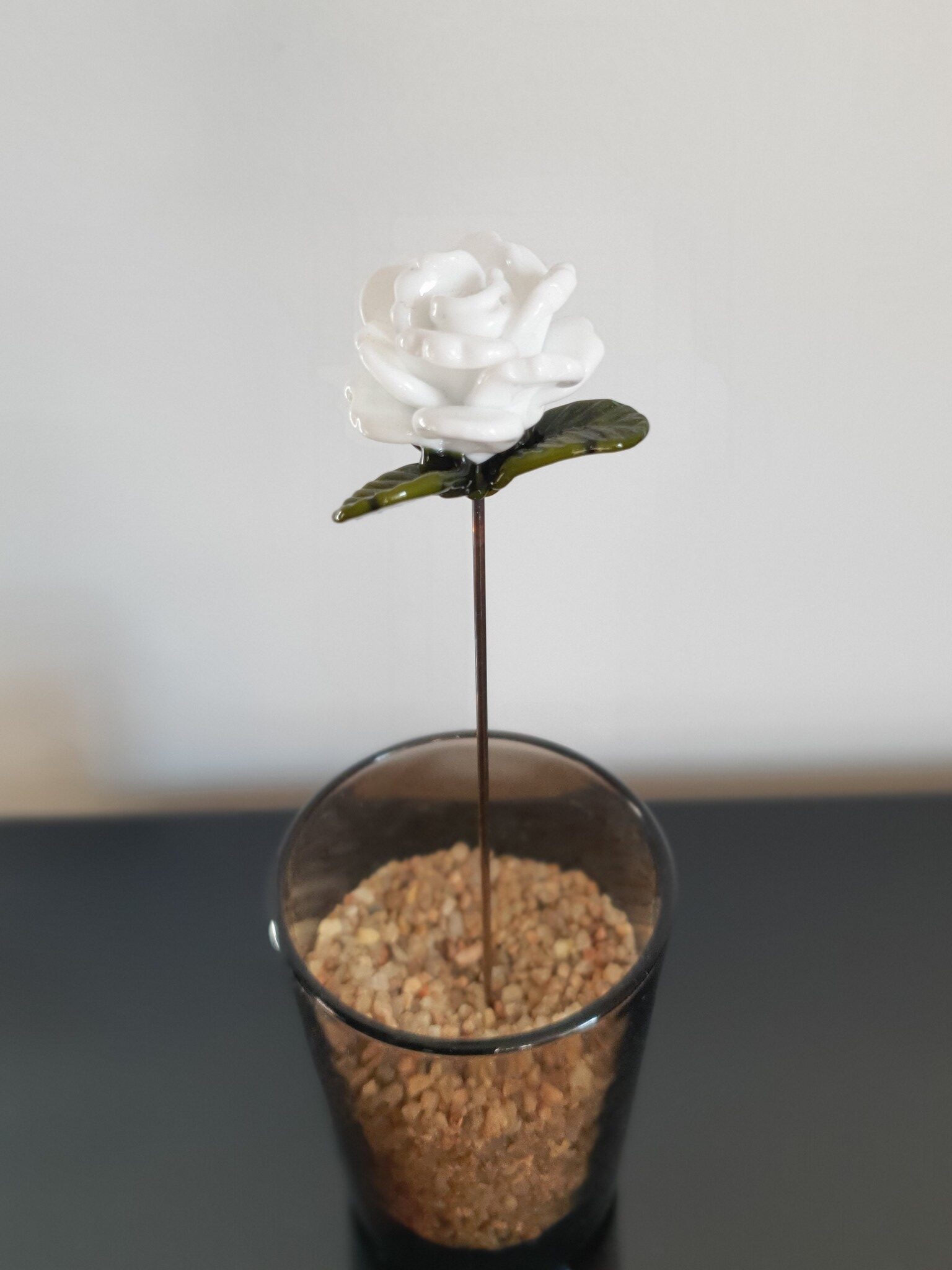 Accueil > Boutique > Fleurs > Roses > Roses sur tiges en inox > Rose blanche éternelle en verre de Murano, sur tige en inox