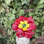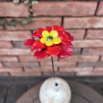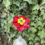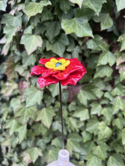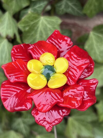 Rose de Noël en verre de Murano, rouge, pistil jaune, cœur vert, sur tige en inox