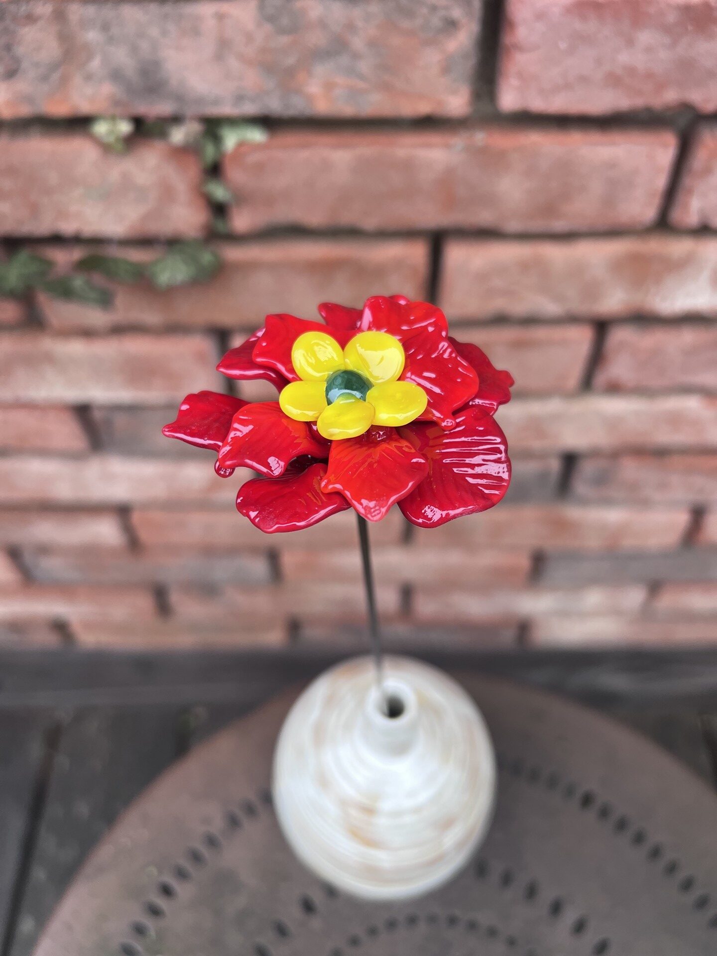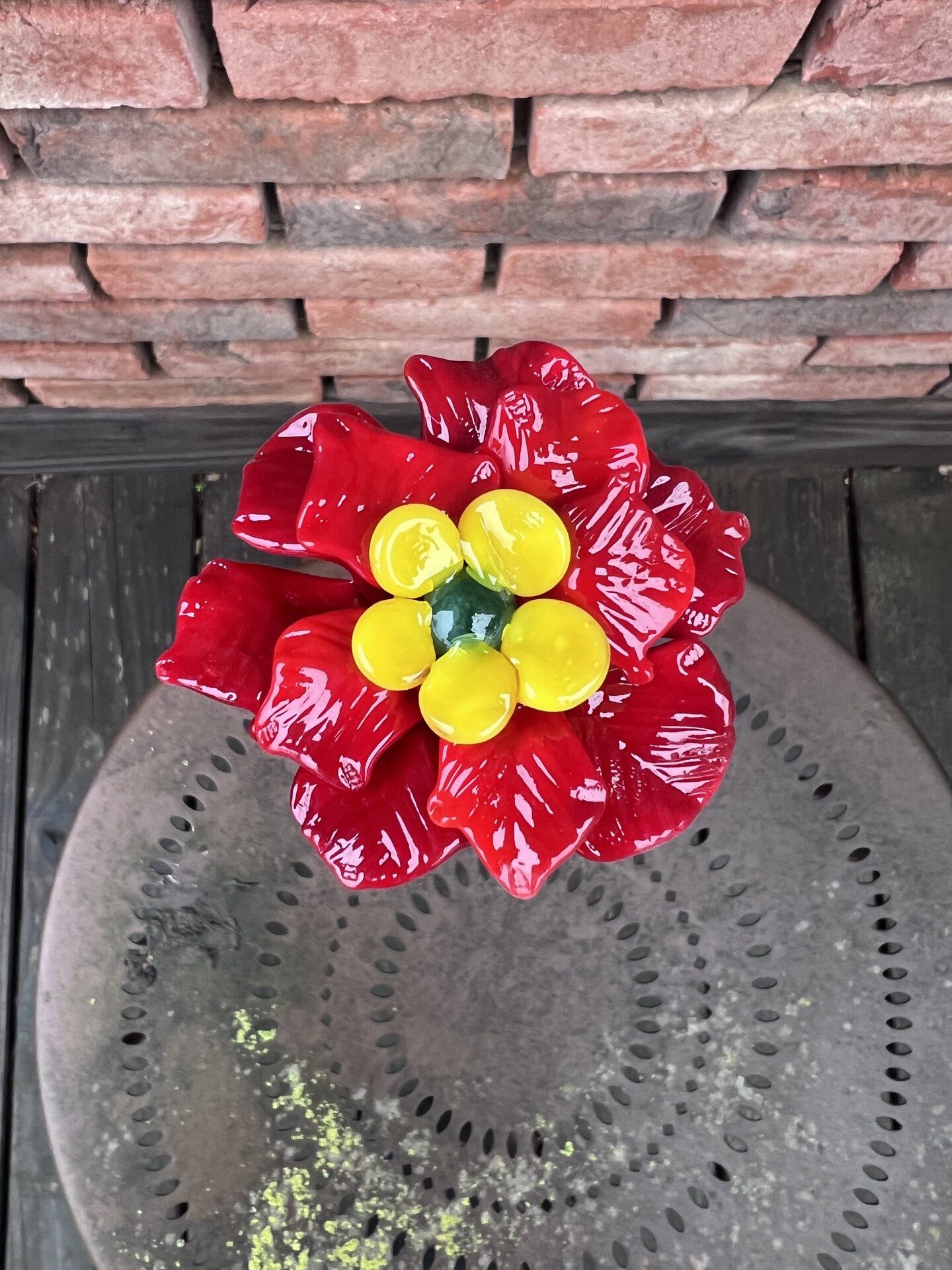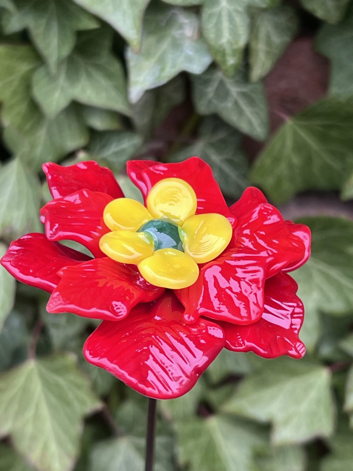 Rose de Noël en verre de Murano, rouge, pistil jaune, cœur vert, sur tige en inox