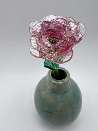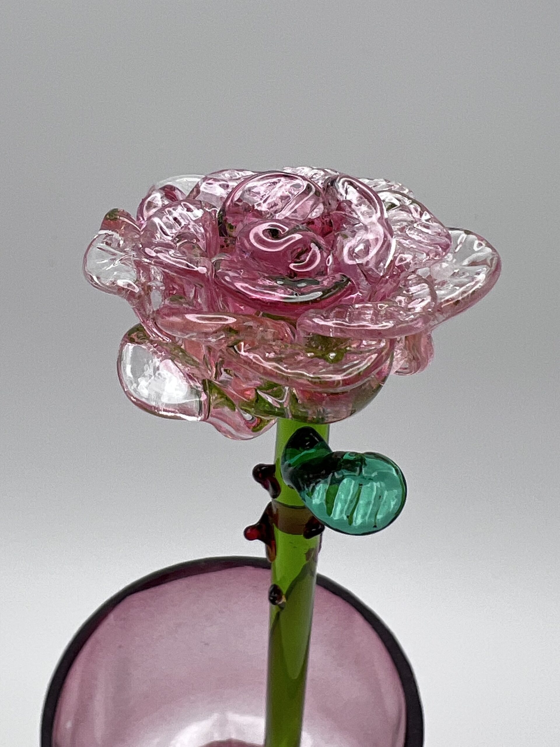 Rose en verre soufflé, couleur rose transparent, sur tige en verre