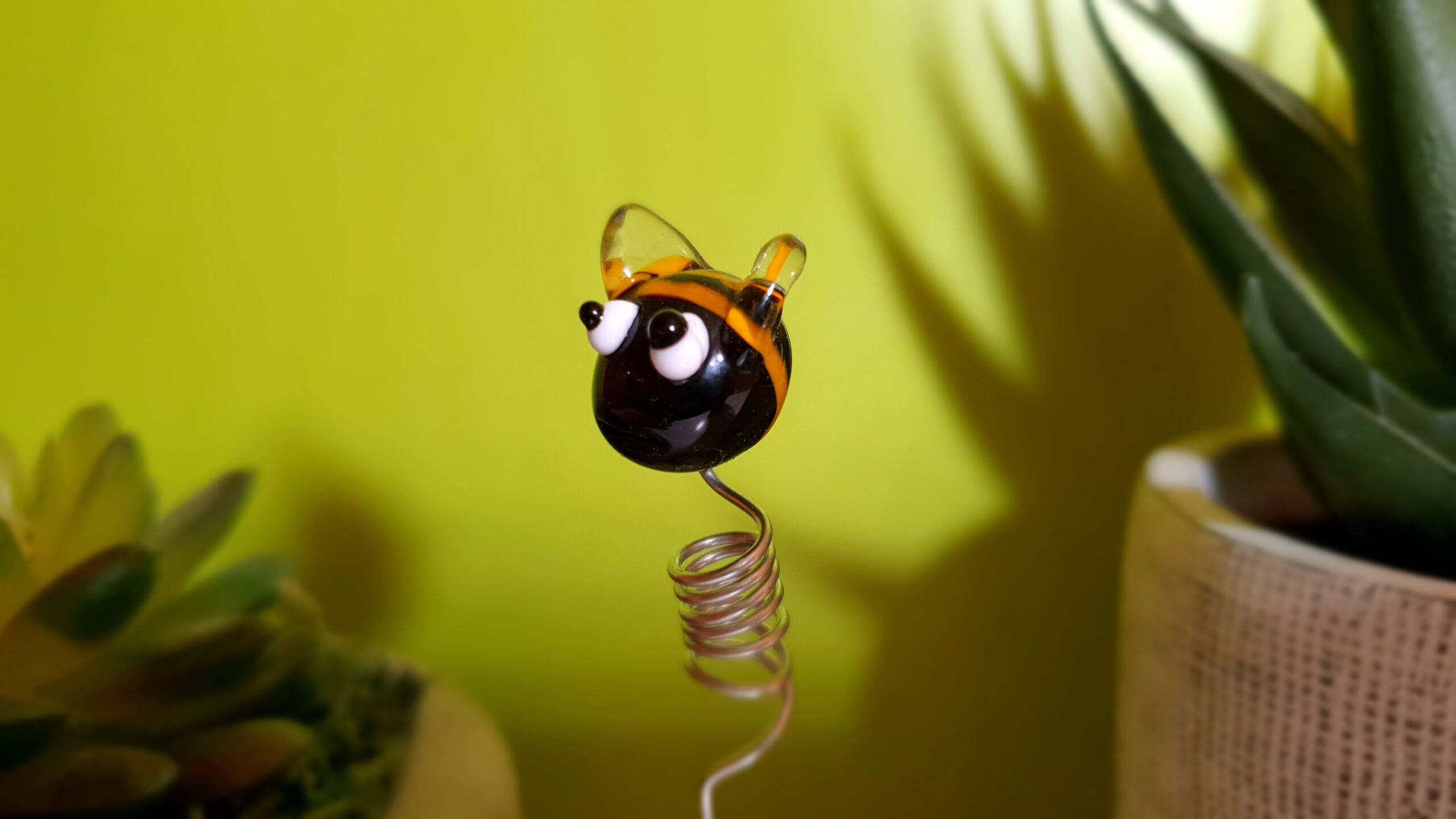Figurine en verre de Murano n°001. Une abeille fabriquée à la main dans mon atelier de Neuville-aux-Bois près d’Orléans, Loiret. Symbole de soleil, de vitalité et de joie de vivre, cette figurine en verre de Murano, rigolote et colorée, est une connexion amusante avec la nature. Délicatement fabriquée à la main à partir de baguettes de verre de Murano, chaque pièce est un objet d’art unique à garder chez soi ou à offrir. Sur une étagère, dans un pot de fleur ou dans votre jardin, sa vue et sa présence vous détendra. Cette abeille est un petit retour en enfance, une jolie décoration en verre, un cadeau original. Créations personnalisées sur demande, n’hésitez pas à me contacter !