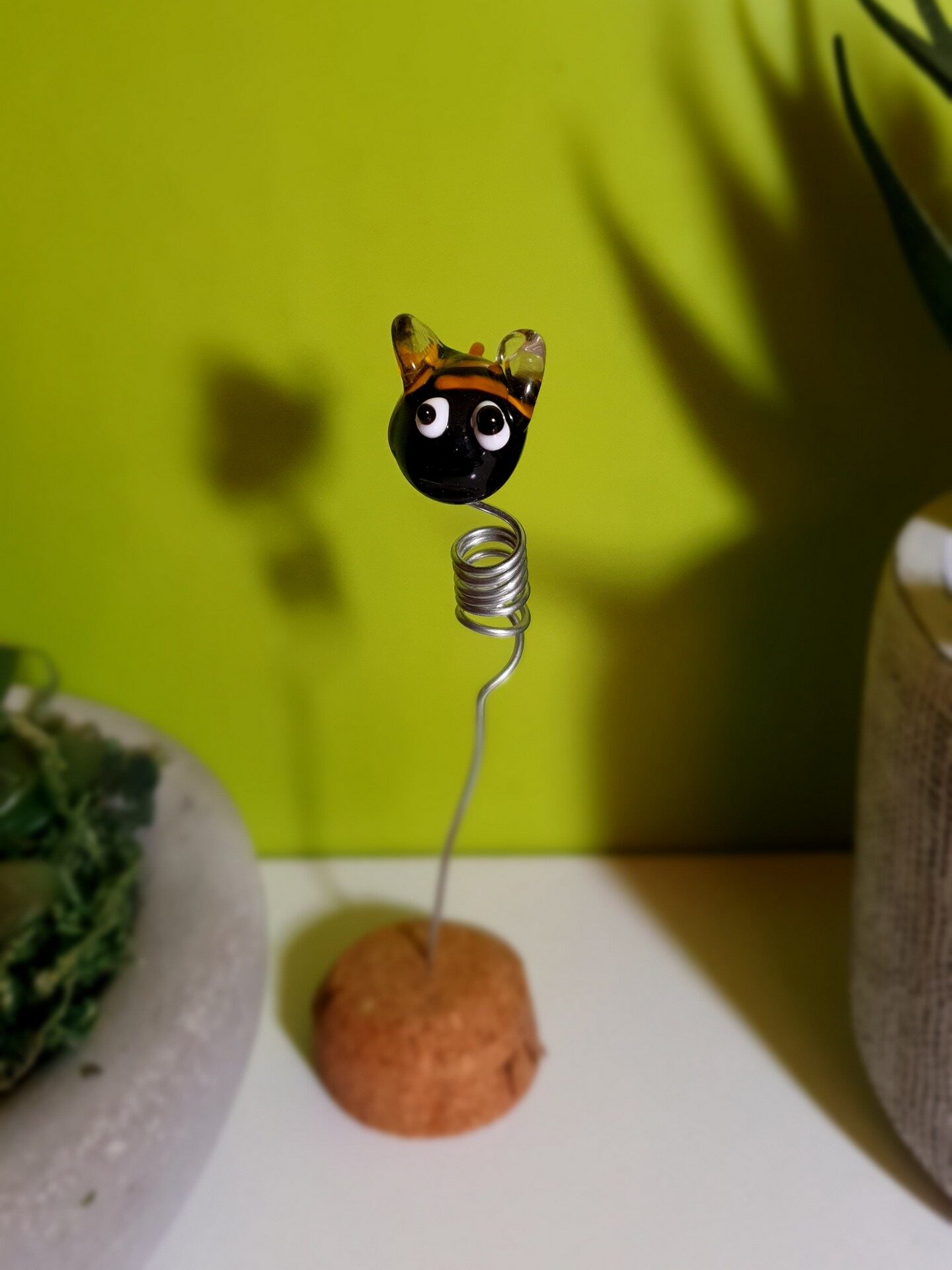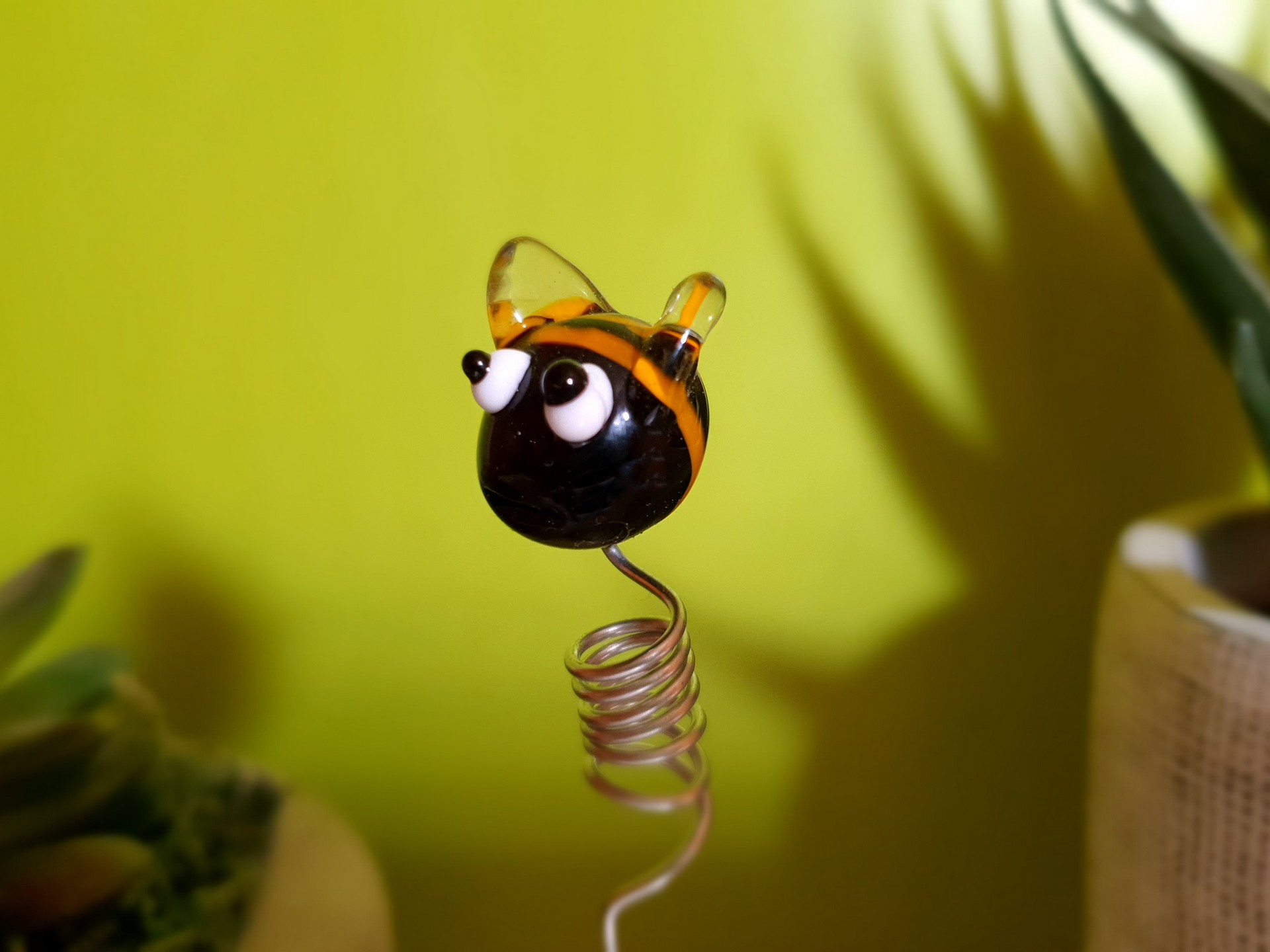 Une petite abeille rigolote fabriquée à la main dans mon atelier de Neuville-aux-Bois. Symbole de soleil, de vitalité et de joie de vivre, cette figurine en verre de Murano est une connexion amusante avec la nature. Posée sur une étagère ou piquée dans un pot de fleur ou dans votre jardin, sa vue et sa présence vous détendra, comme un petit retour en enfance. Je créé des figurines selon mes envies ou sur demande alors n’hésitez pas à me contacter si vous souhaitez une création personnalisée, et nous l’étudierons ensemble. Petite abeille en verre de Murano : une jolie décoration en verre, un cadeau original.