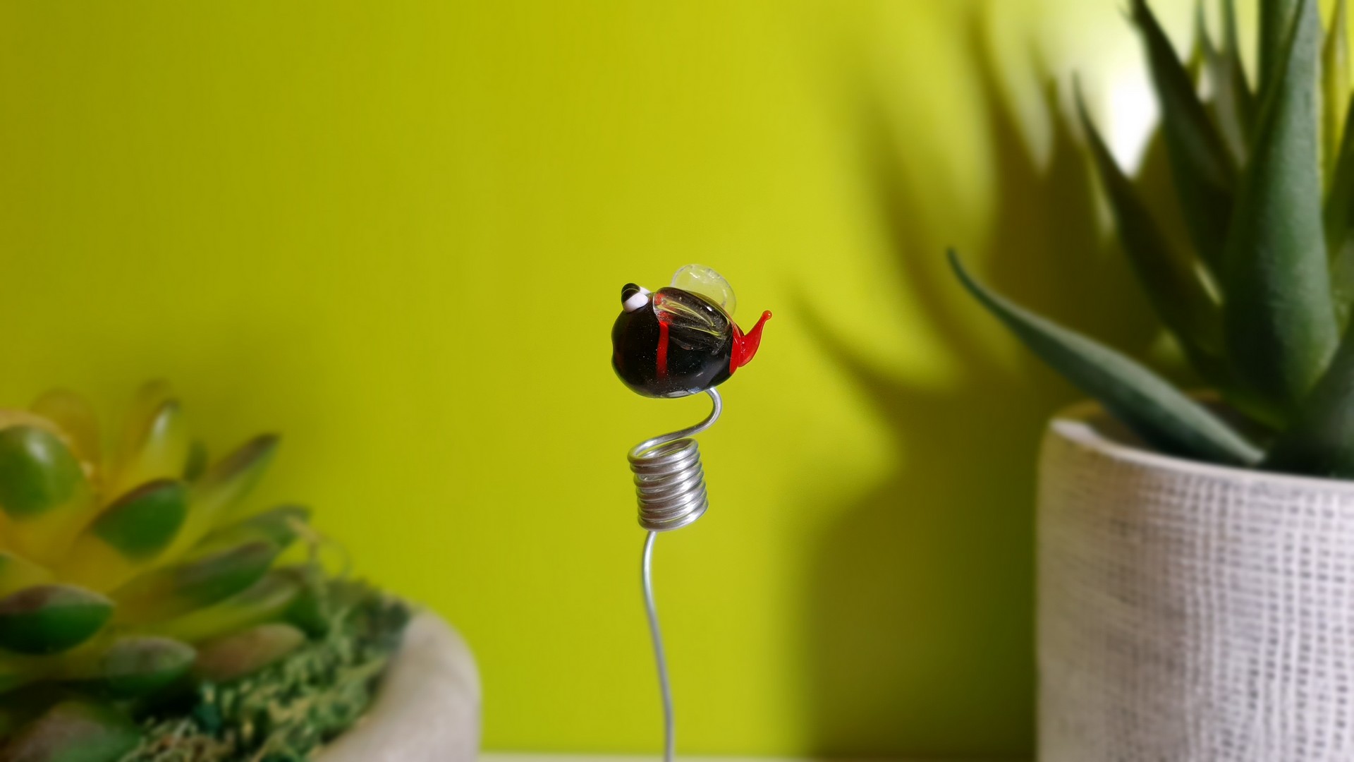 Une petite abeille rigolote fabriquée à la main dans mon atelier de Neuville-aux-Bois près d’Orléans, Loiret. Symboles de soleil, de vitalité et de joie de vivre, les figurines en verre de Murano sont une connexion amusante avec la nature. Posées sur une étagère ou piquées dans un pot de fleur ou dans votre jardin, leur vue et leur présence vous détendra, comme un petit retour en enfance. Je créé des figurines selon mes envies ou sur demande alors n’hésitez pas à me contacter si vous souhaitez une création personnalisée, et nous l’étudierons ensemble. Petite abeille en verre de Murano : une jolie décoration en verre, un cadeau original.