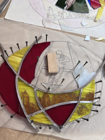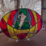 Un vitrail rugby personnalisé réalisé sur demande par des amoureux du rugby et surtout du Sporting Club Chinon Rugby. Après s’être mis d’accord sur la forme et les dimensions du vitrail, j’ai proposé plusieurs dessins. La forteresse royale de la vieille ville de Chinon, que le joueur semble fouler, rappellent que le rugby est un sport de terroir ancré sur des bases solides. Un sport d’engagement et de solidarité, comme le souligne l’allure du rugbyman, bien déterminé à faire avancer son équipe. Je ne pouvais pas oublier les couleurs sang et or du Sporting Club de Chinon. Le rouge pour le courage et l’engagement. Le jaune pour le partage, le respect et la fraternité que porte le rugby.