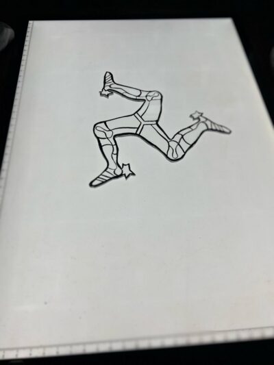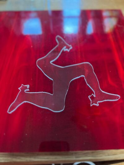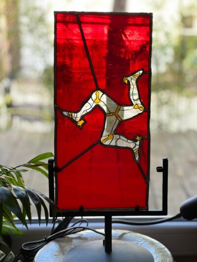 Vitrail Triskèle Ile de Man créé sur commande en 2024 pour un mécanicien fan de moto.