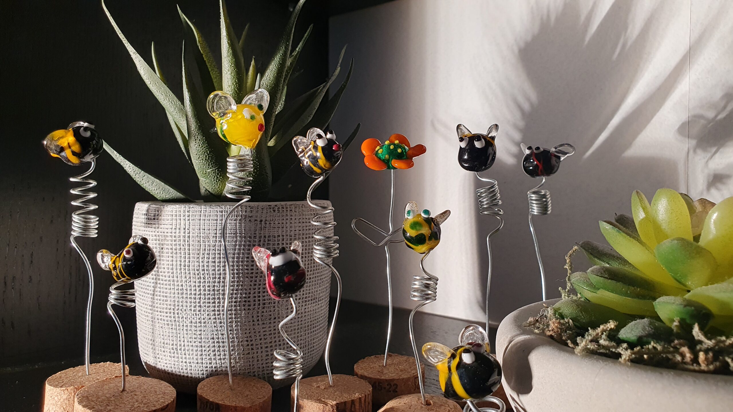 Fabriquées à partir de baguettes de verre sous la flamme de mon chalumeau, mes figurines sont des connexions amusantes avec la nature. Des abeilles jusqu’aux dinosaures, en passant par les éléphants, les tortues, les hérissons, les poissons, les champignons, les insectes… la vue et la présence de mes petits personnages animaliers ou végétaux détend. Comme un petit retour en enfance ! Rigolotes et colorées, ces figurines en verre de Murano feront également une jolie décoration dans un terrarium, un aquarium ou une étagère.